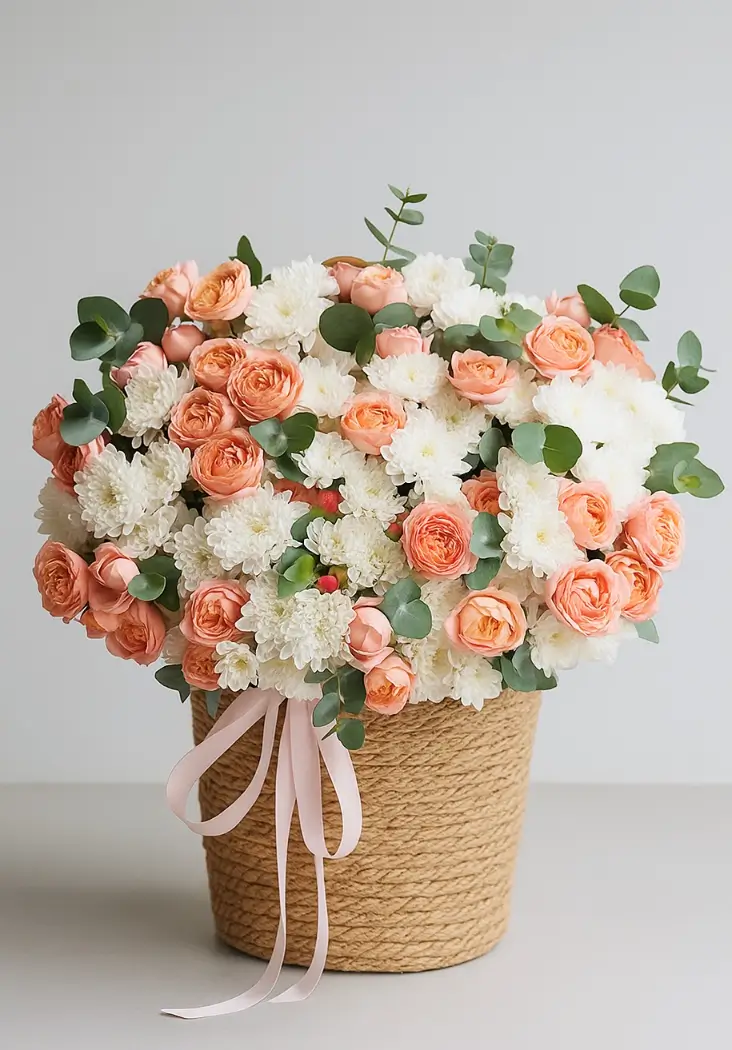 Состав: кустовые розы — 15, хризантемы — 10 , эвкалипт, кашпо.