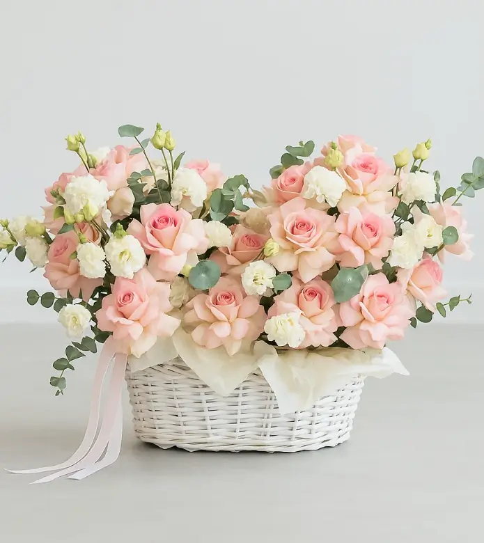Состав: Эустомы — 10 шт, французские розы — 25 шт, эвкалипт, корзина