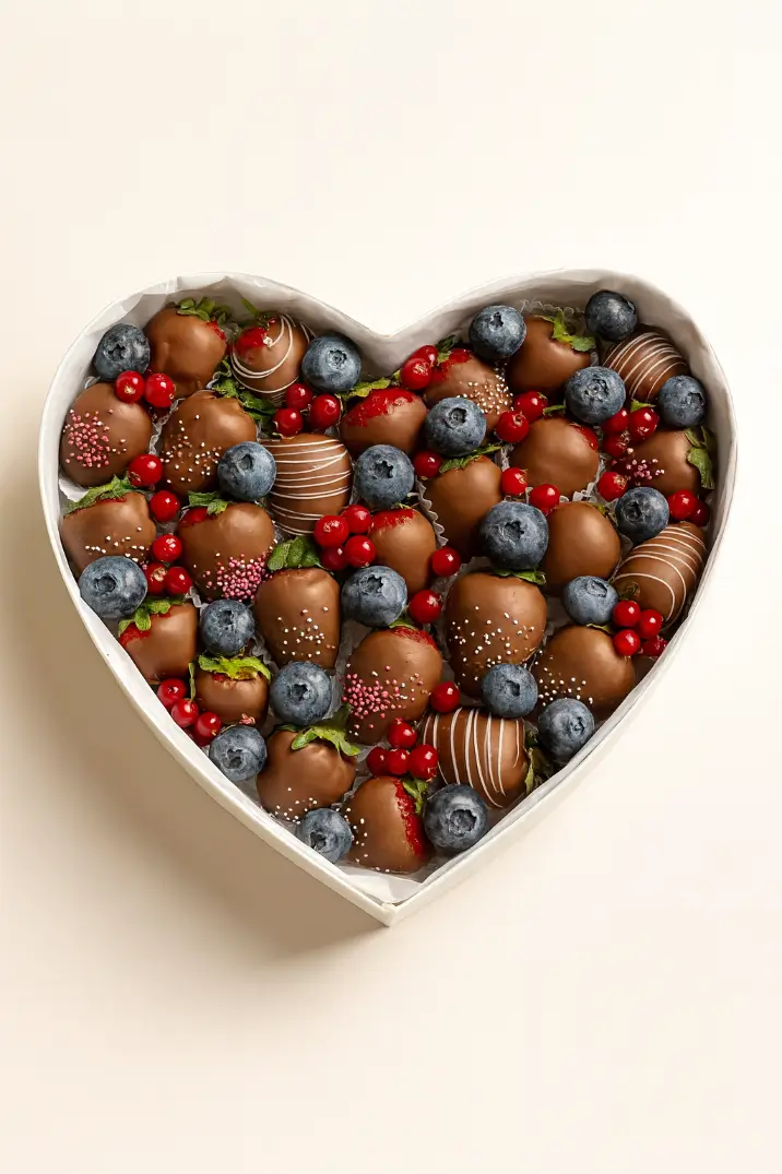 Состав: клубника в молочном бельгийском шоколаде Callebaut — 25 шт, голубика, малина.