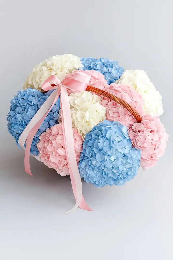 Состав: розы — 15 шт, лизиантусы — 5 шт, спрей розы — 4 шт, гортензии — 2 шт, эвкалипт.
