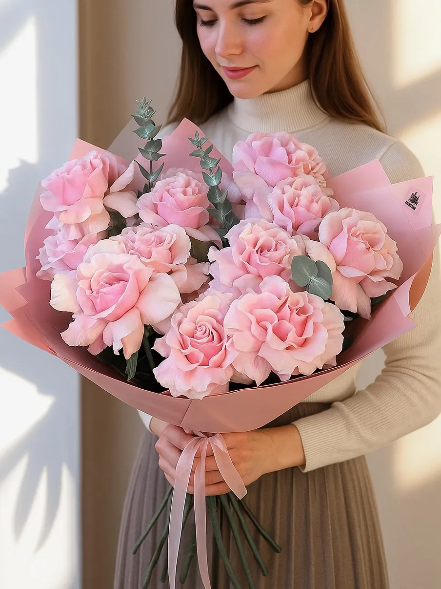 Состав: розы роста Джульетта —  шт, лизиантусы — 3 шт, розы сорта Pink Mondial- 9 шт, эвкалипт.