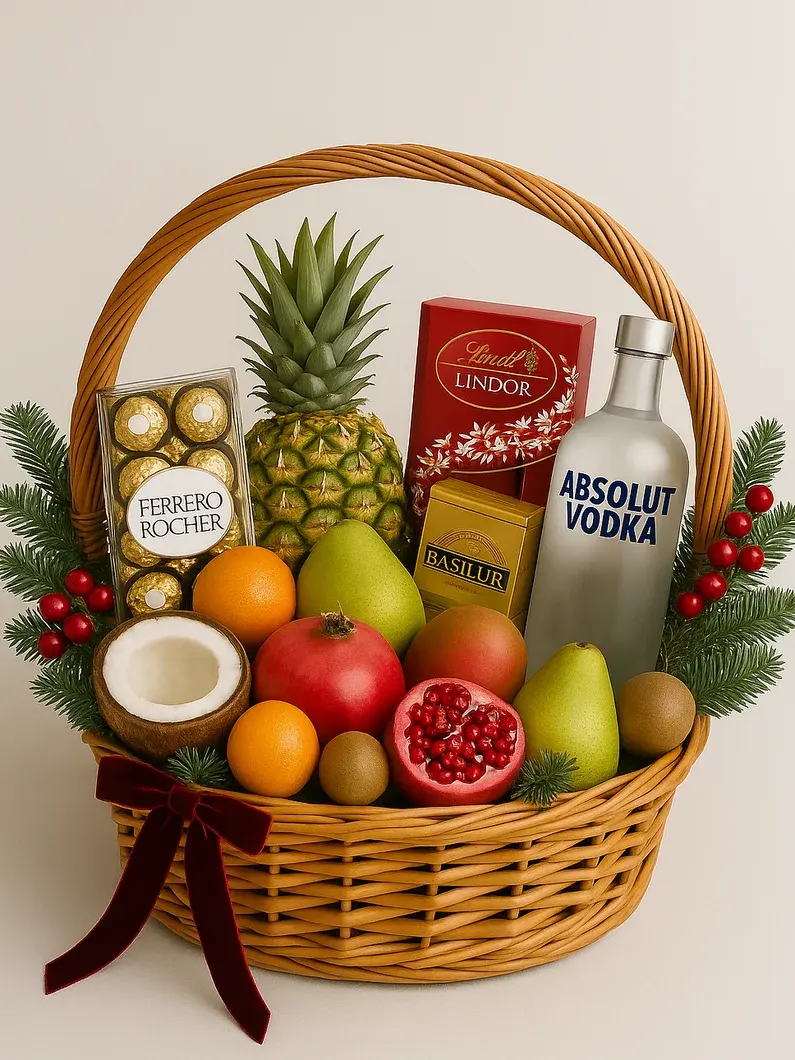Состав: корзина, иликс, лапа, оазис, шпажки, алкоголь, Lindor, средний Ferrero, Basilur, ананас, 2 граната, 2 манго, кокос, апельсин, 2–3 мандарины, 2–3 киви, груша.
