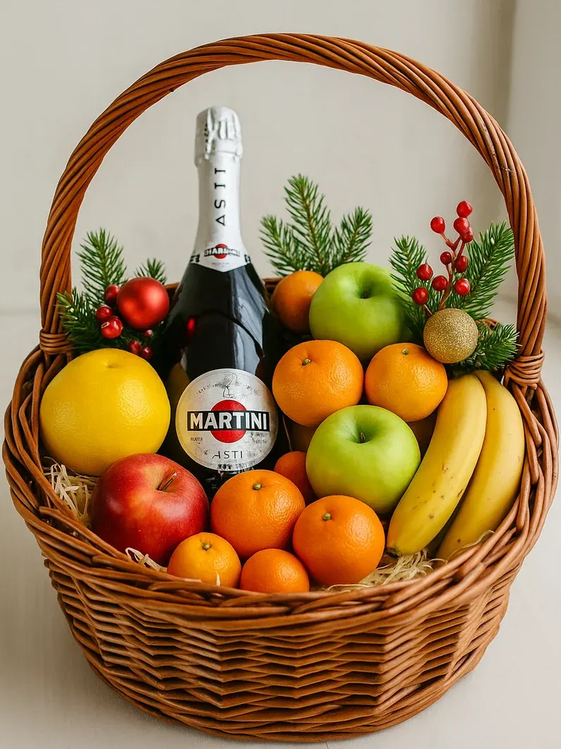 Состав: корзина, иликс, лапа, шпажки, оазис, шарики, мартини, бананы, зелёные яблоки, красные яблоки, апельсин, мандарины, мини мандарины.