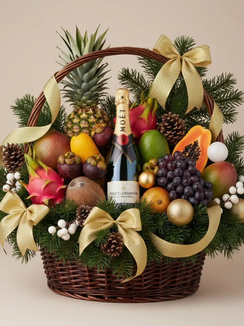 Состав: корзина, оазис, иликс, лапы, шпажки, шишки, шарики, Моет, ананас, драгоны, папайи, манго, кокос, мангустины, мандарины.