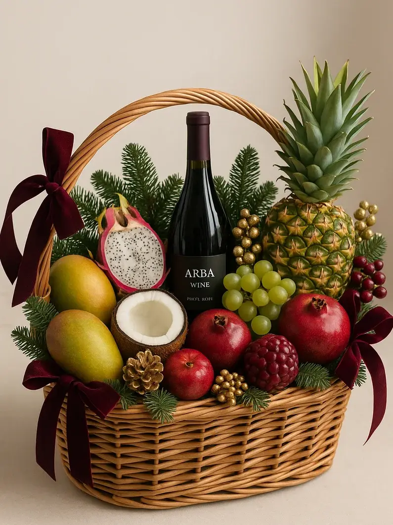 Состав: корзина, иликс, лапа, шишка, оазис, шпажки, алкоголь Арба, ананас, манго, кокос, драгонфрут, виноград зелёный, гранаты, красные яблоки.