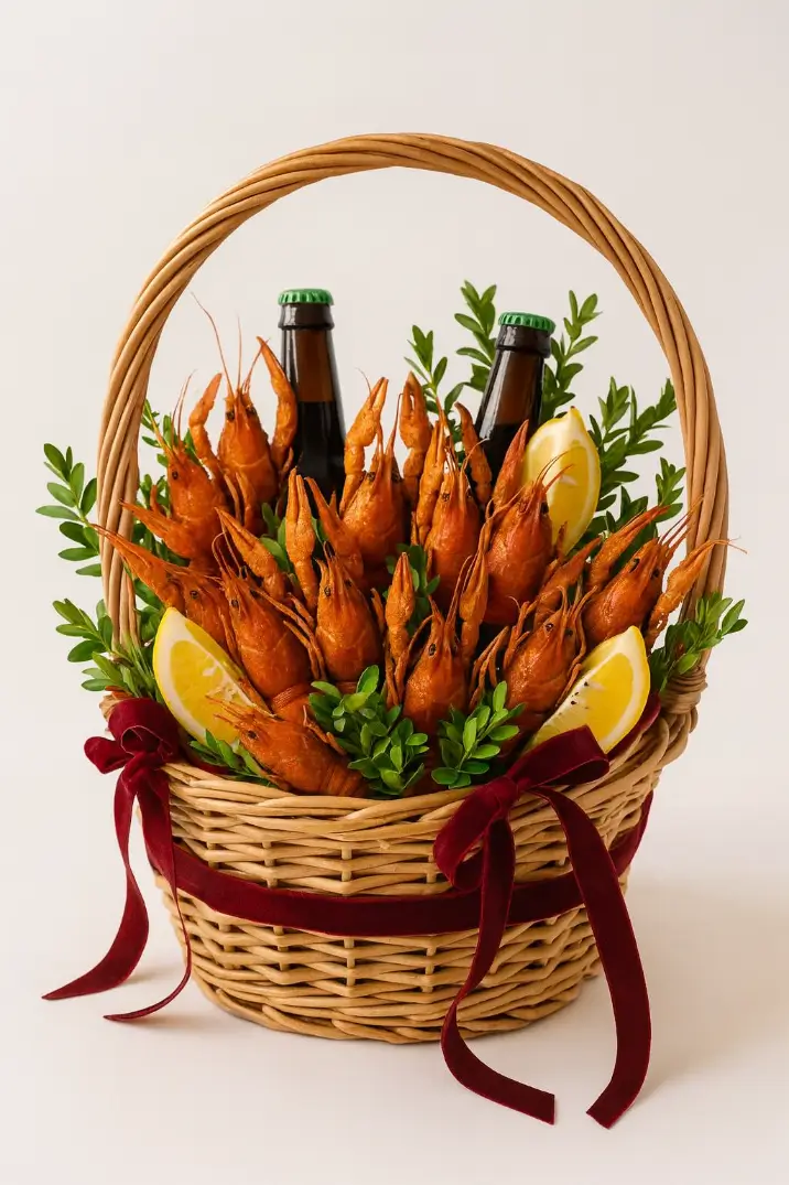 Состав: лимоны дольки — 3 шт, раки 11 штук, пиво — 2 бутылки, зелень.
