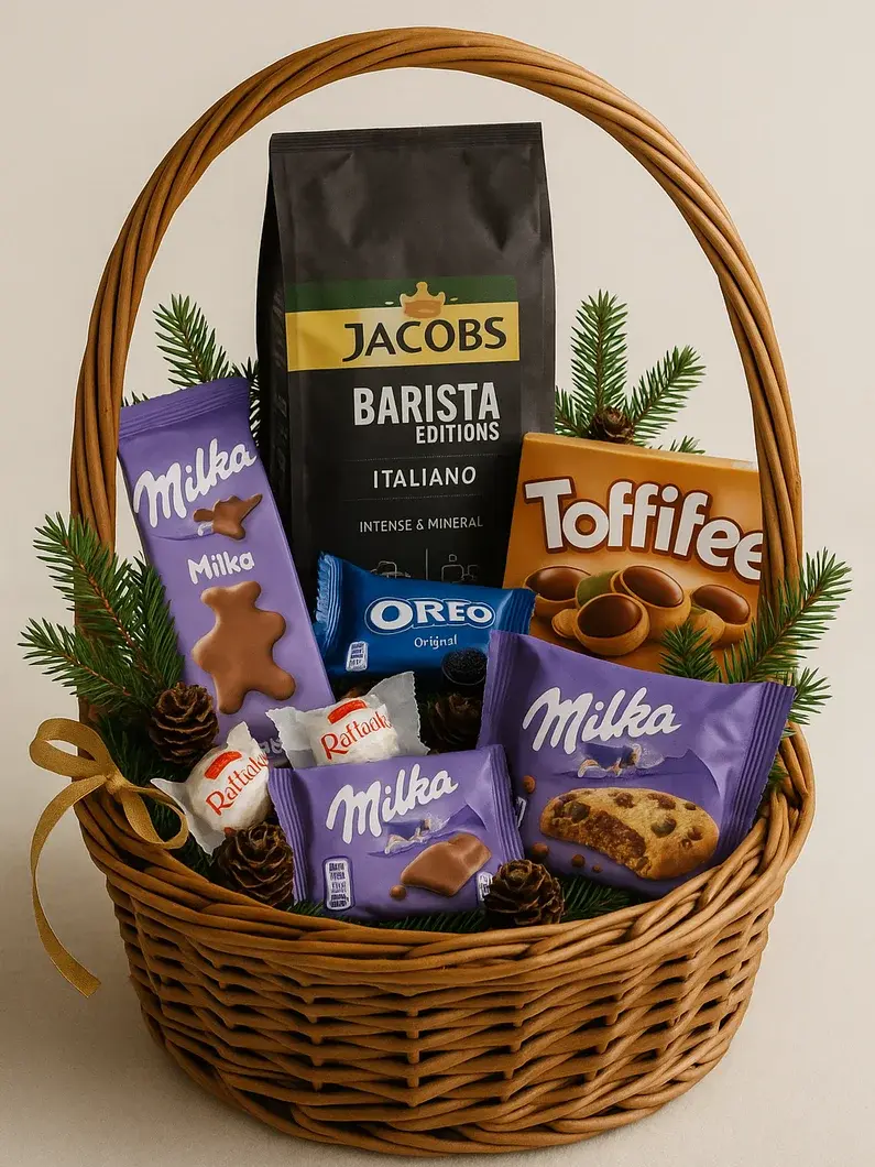Состав: корзина, 5 шишек, лапа, Тофифи, Milka печенье, Milka палочки, Коровка, Oreo, 2 шт. Raffaello.