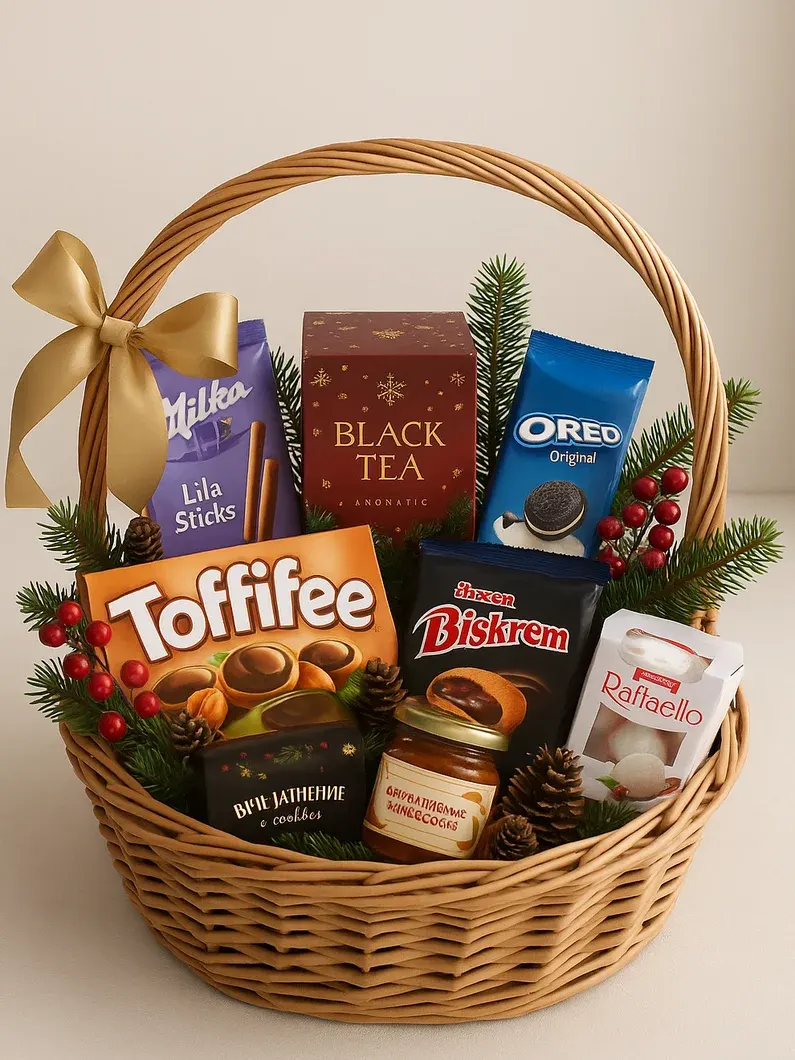 Состав: корзина, иликс, 5 шишек, лапа, Milka палочки, чай (типа Basilur), Oreo, Тофики, Бискрим, Raffaello, конфеты вишня в шоколаде, апельсиновое варенье.