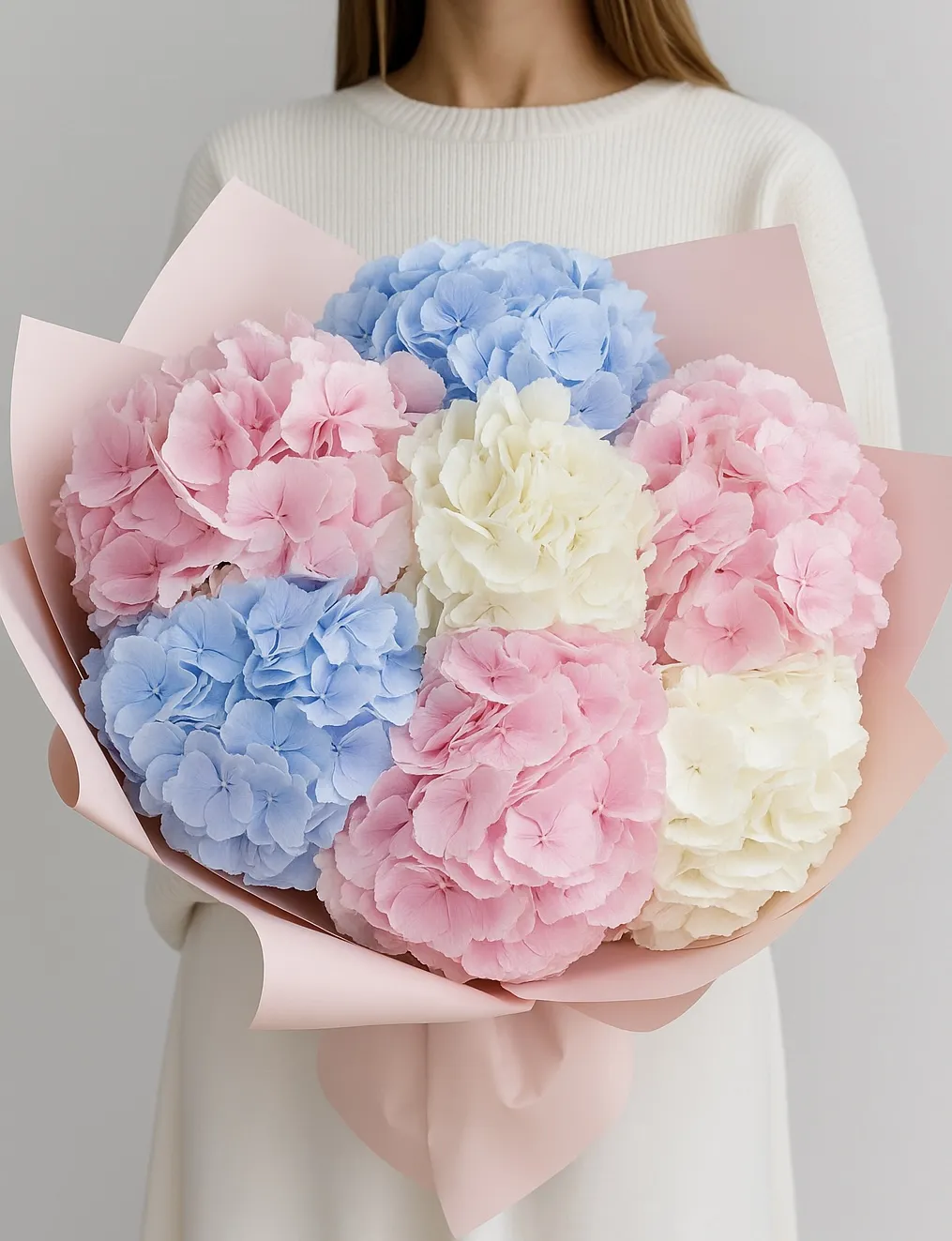 Состав: гортензии — 1 шт, лизиантусы — 5 шт, розы — 7 шт.