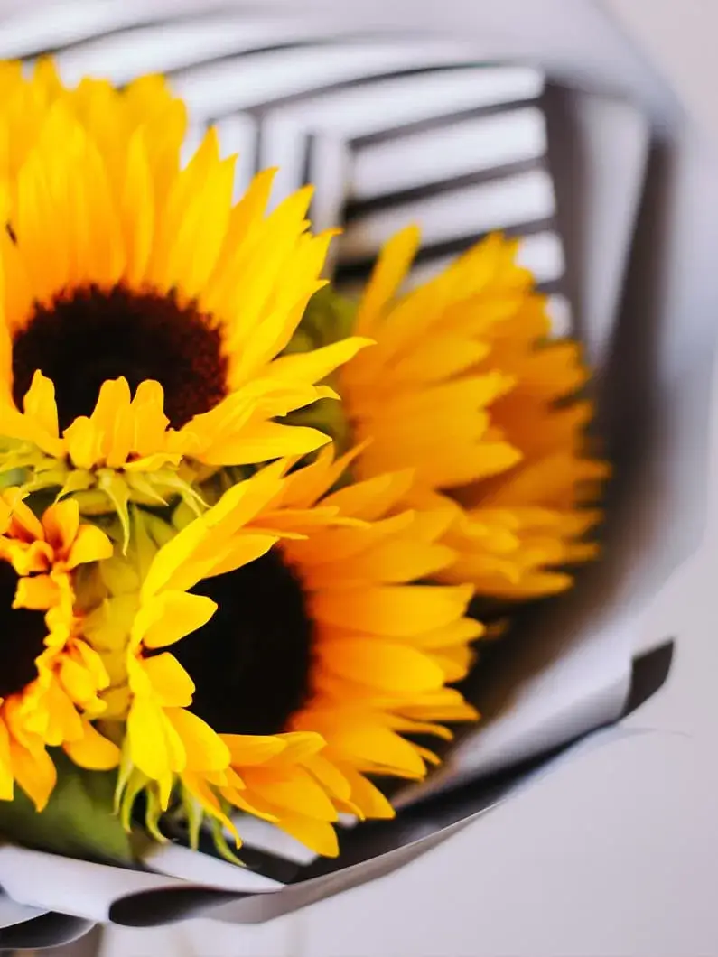 Букет из подсолнухов в бумаге подарит положительные эмоции получателю. Яркие цветы означают хорошее настроение, жизнерадостность. Удивительная цветочная композиция станет приятным сюрпризом для близкого человека. Букет можно преподнести человеку, чтобы пожелать удачи и благополучия.