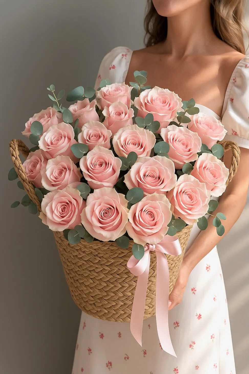 Состав: кустовые розы — 15 шт, эвкалипт.
