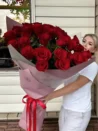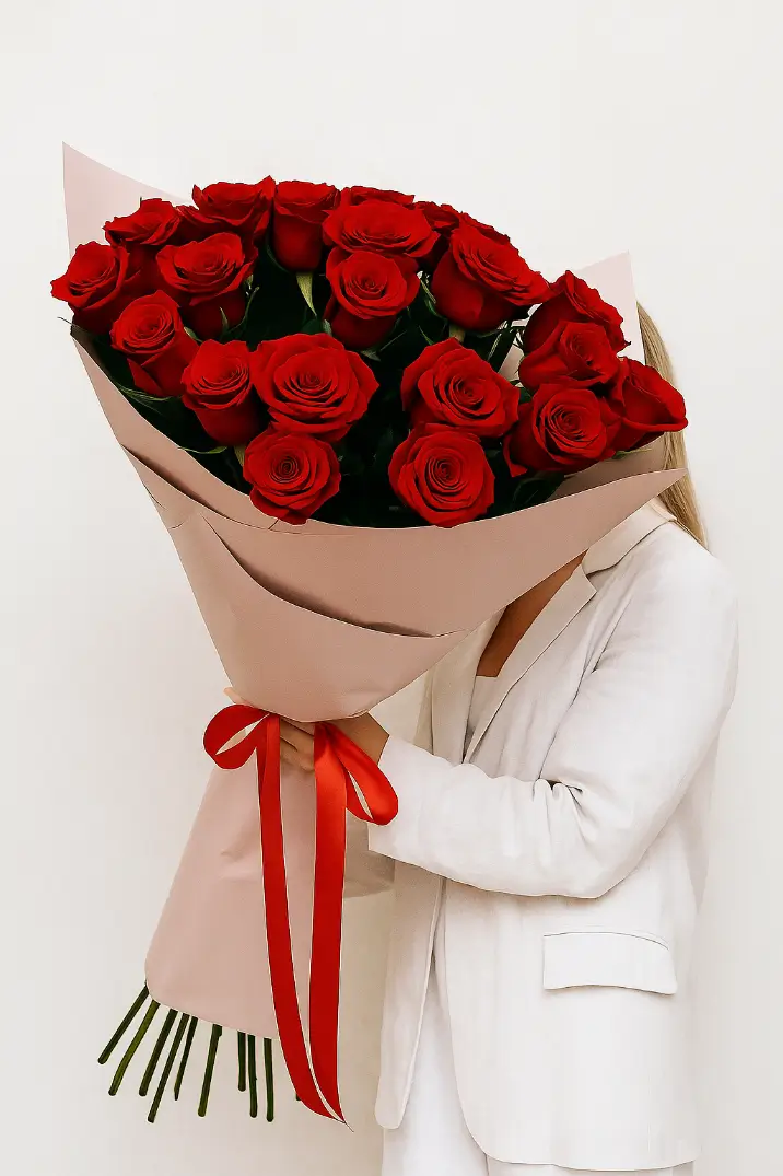 25 метровых роз – это шикарная охапка цветов, не требующая специального оформления. Крупные бутоны на длинных стеблях выглядят великолепно и подходят для любого торжественного случая. Это пожелания счастья и удачи, любви и доверительных отношений. Дарят на свадьбу, день рождения и юбилей, день всех влюбленных.
