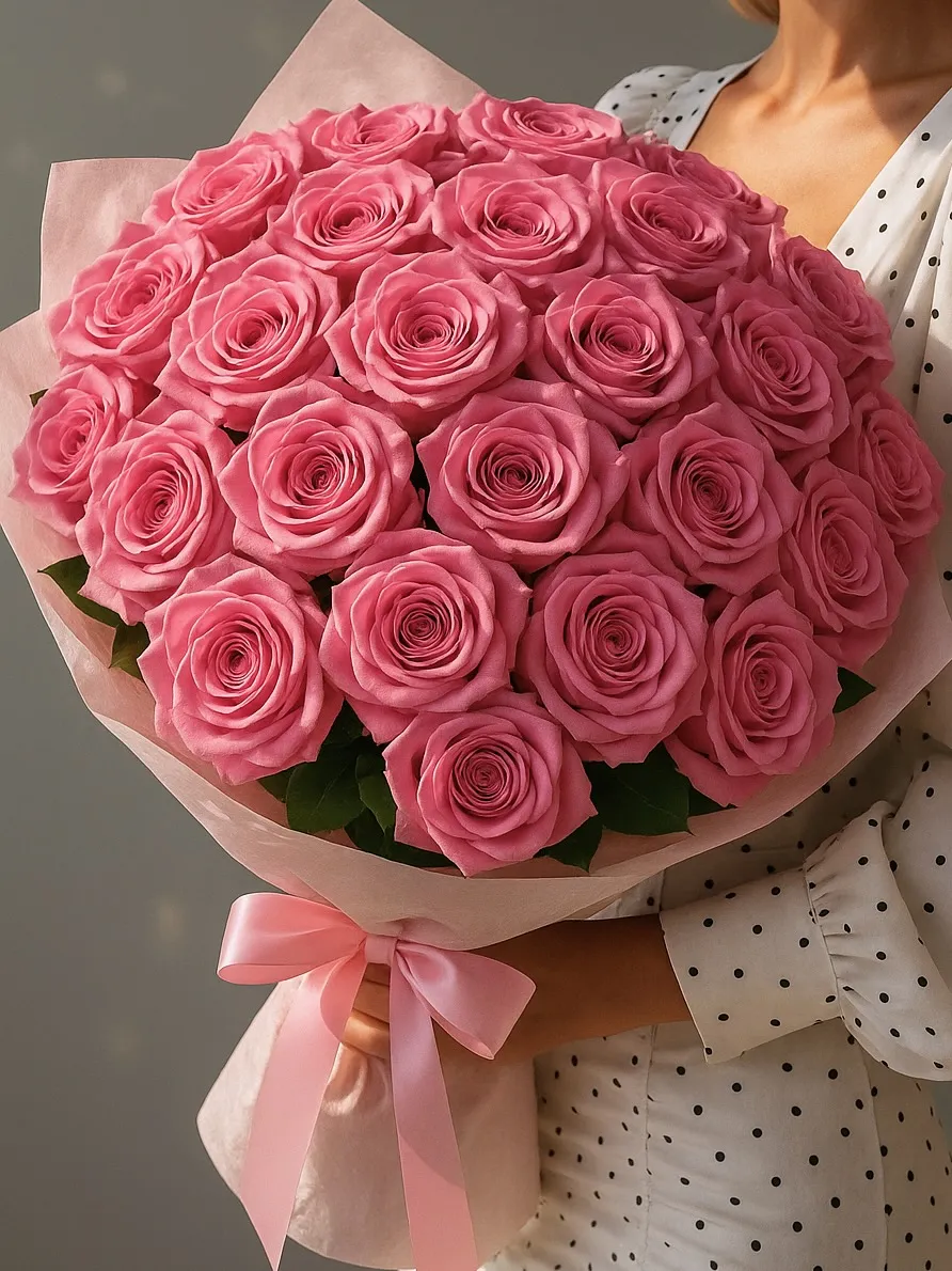 Букет из 25 розовых роз мечтает получить каждая женщина. Нежный цвет «королевы цветов» подчеркивает лаконичное оформление. Это пышный букет, который подойдет на любой торжественный случай. Розовые розы означают искренность и благородные чувства, чистоту и пожелание счастья. Дарят на день рождения, юбилей, 8 марта.