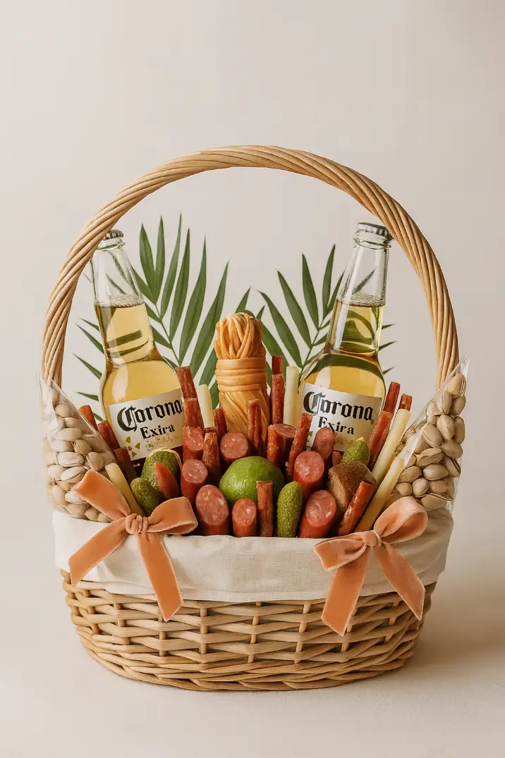 Состав: пиво «Corona Extra» — 2 бутылки, чечил, охотничьи колбаски, колбаса сырокопчёная, пепперони, солёные огурцы, арахис, фисташки, гарлики.