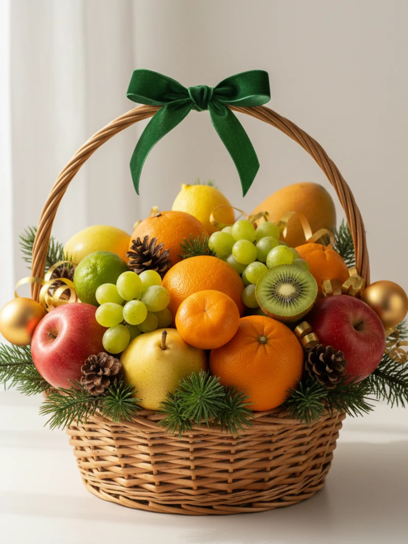 Состав: корзина, иликс, лапы, шпажки, оазис, шишки, шарики, красные яблоки, манго, лимон, апельсины, лайм, киви, мандарины, мини мандарин, виноград зелёный.