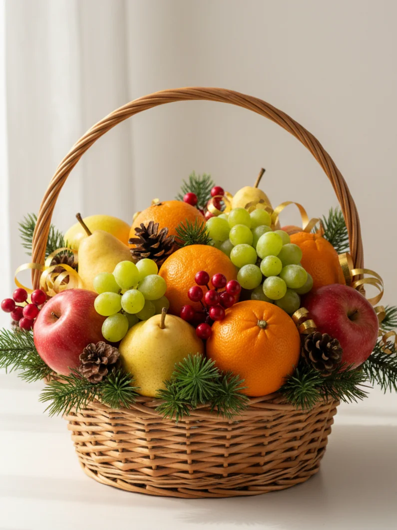 Состав: шпажки, иликс, корзина, оазис, шишки, лапы, красные яблоки, груши, виноград зелёный, апельсины.
