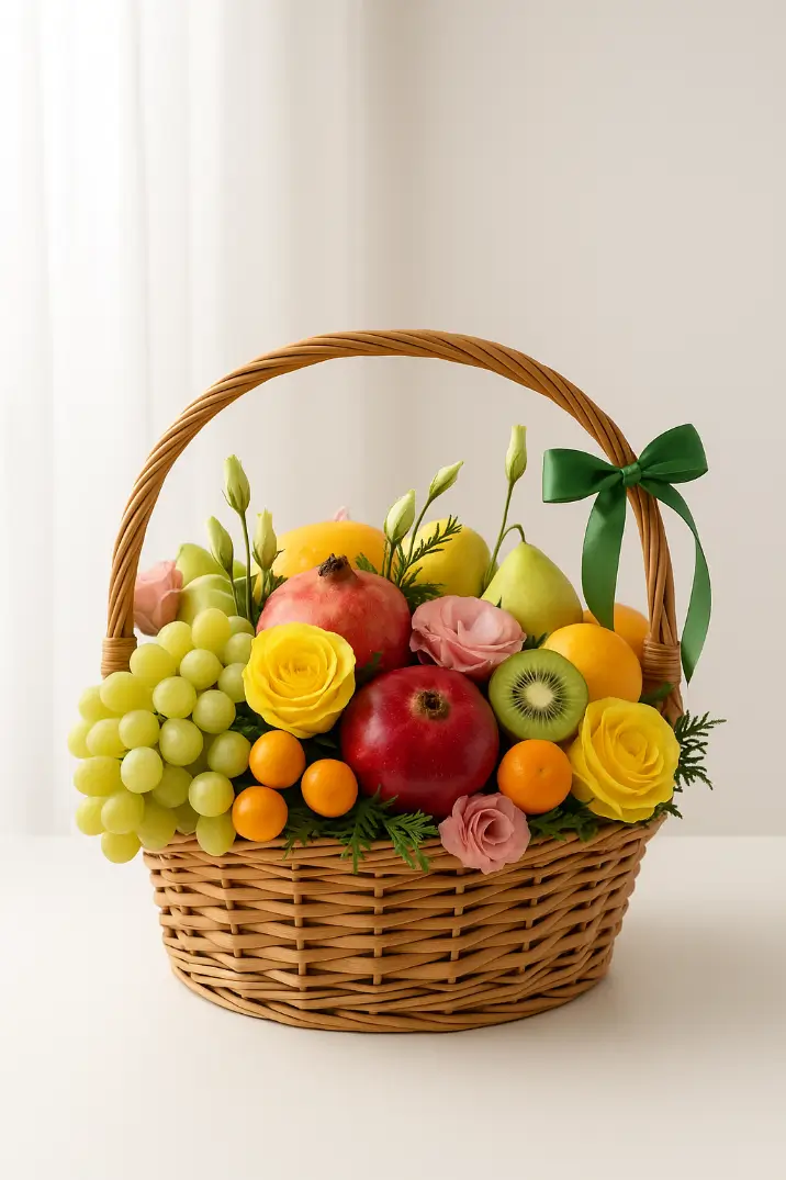 Состав: виноград, яблоко, груши, гранат, лимон, мандарины, макаруны, алыча, розы, лизиантусы.