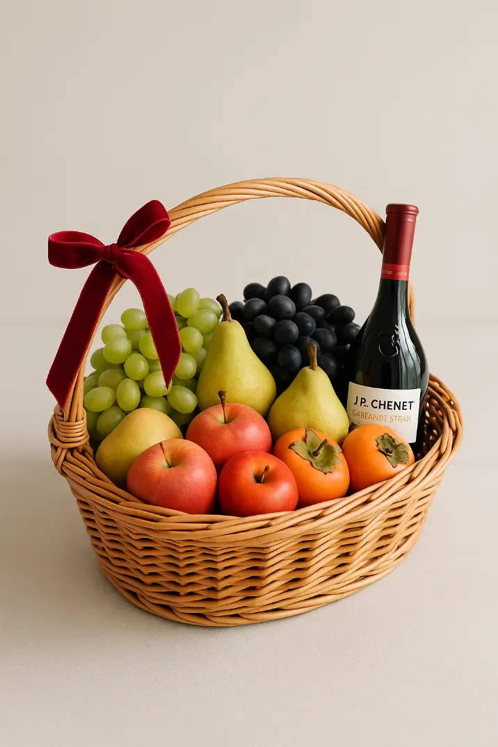 Состав: виноград, хурма — 2 шт, яблоко, груши — 3 шт, вино JP. Chenet Cabernet–Syrah (France) — 1 бутылка.