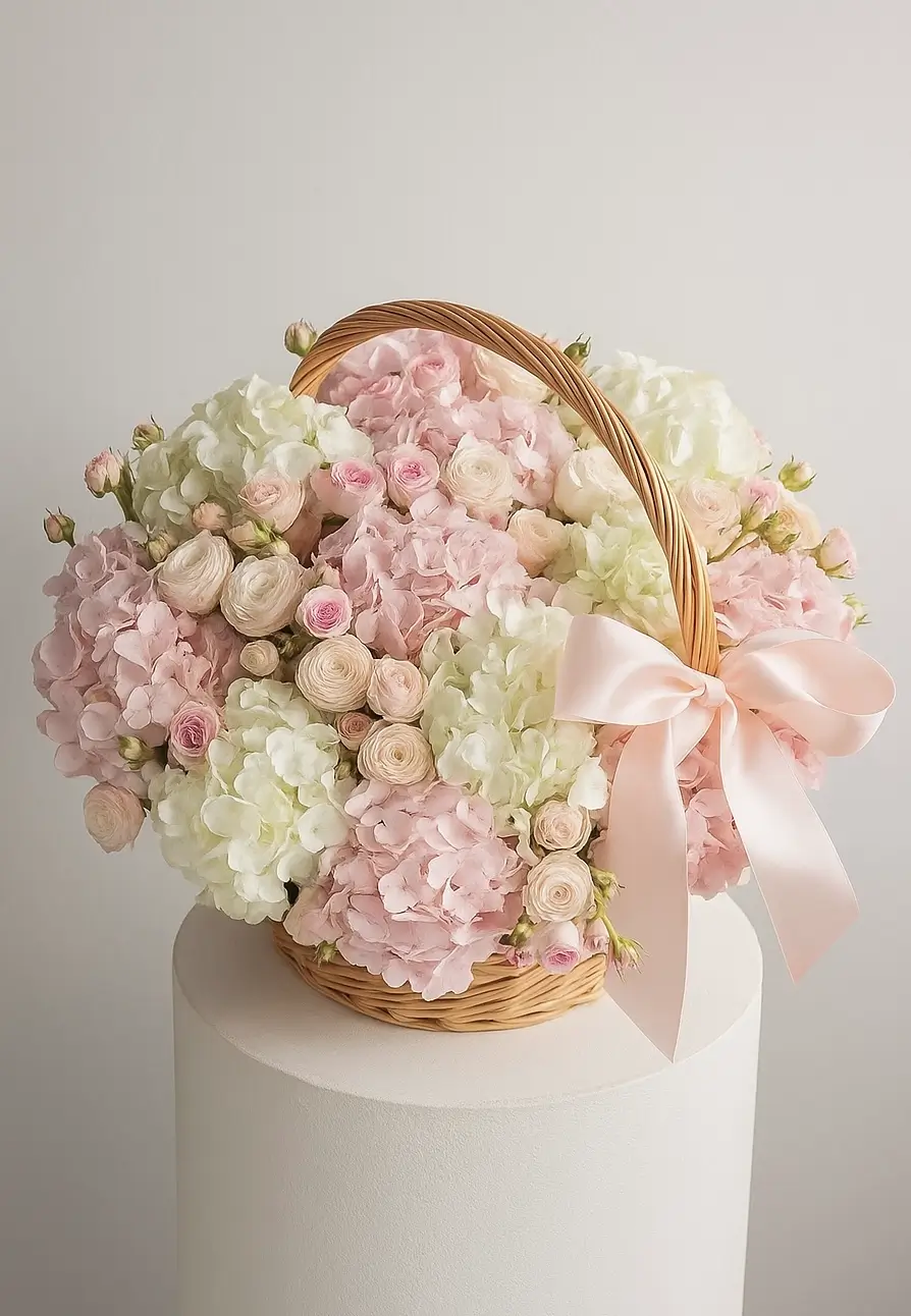 Состав: гортензии — 15 шт, спрей розы — 13 шт, корзина.