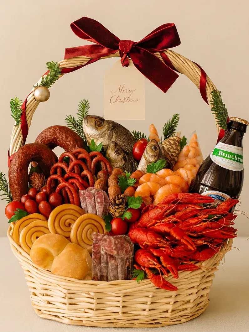 Состав: корзина, лапа, шпажки, оазис, 3 шишки, Heineken, кулёк арахиса, три рыбы, раки пол ведра, колбаса палка, 2 краковские, черри, косичка, 2 Кадыров, охота пачка, пепперони 200 г, креветки 200 г, фисташки кулёк.
