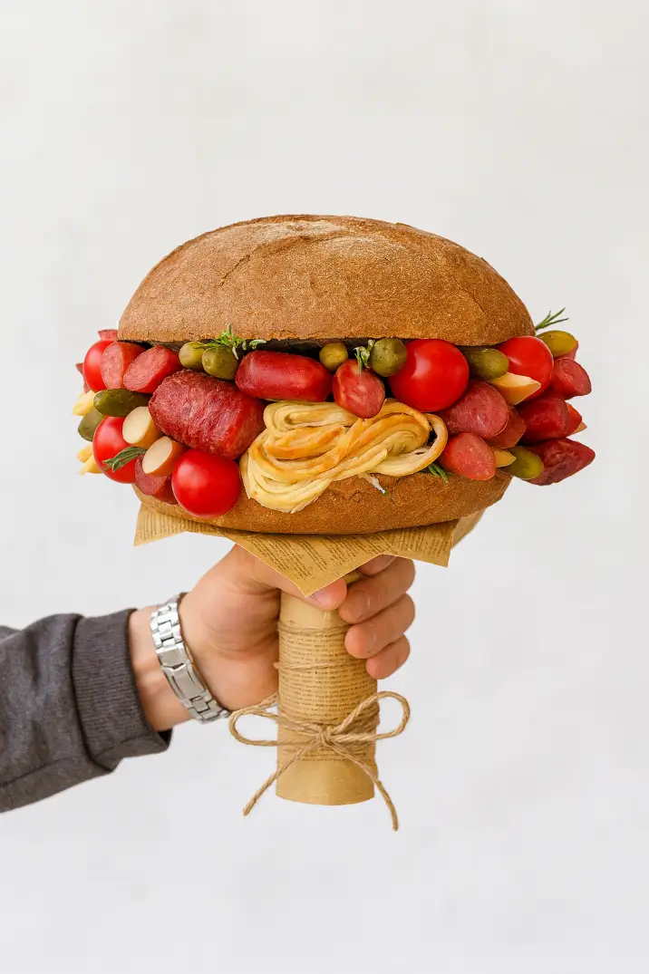 Состав: чечила — 2 вида, охотничьи колбаски, бастурма, соленые огурчики, помидоры, хлеб.