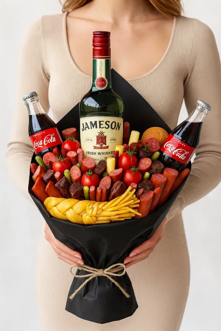 Состав: охотничьи колбаски, колбаски пепперони, чечил — 2 вида, гарлики, помидоры черри, соленые огурчики, булки, виски — 0,7 л, coca-cola — 2 бутылки.