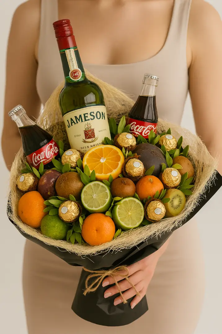 Состав: апельсины, мандарины, киви, лайм, гранат, конфеты «Ferrero Rocher» -8шт, виски — 0,7 л, coca-cola — 2 бутылки, зелень. (стоимость коробки с сухофруктами оплачивается отдельно — 17000 тг.)