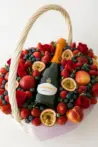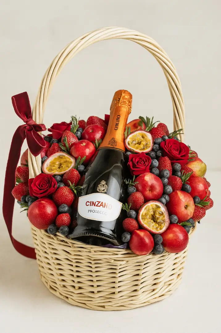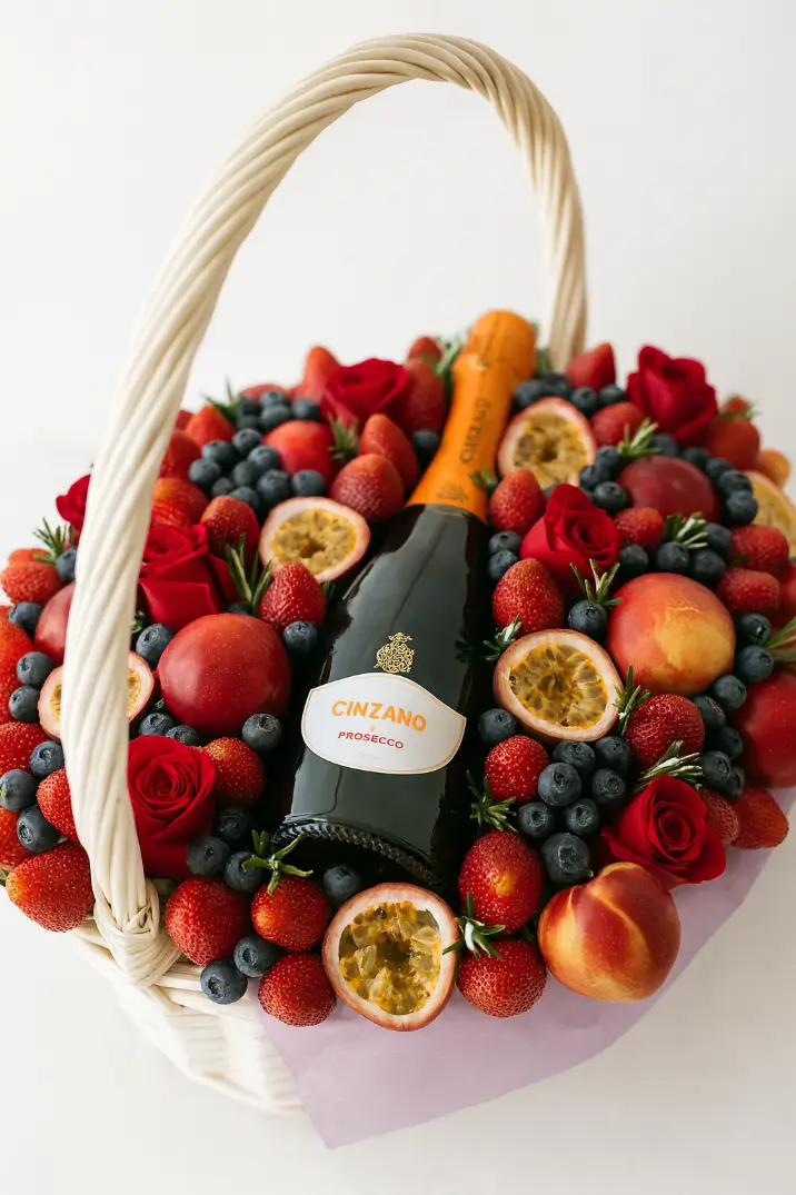 Состав: игристое вино Cinzano Prosecco — 1 бутылка, маракуя, нектарин, голубика,  клубника, розы и еловые ветки.