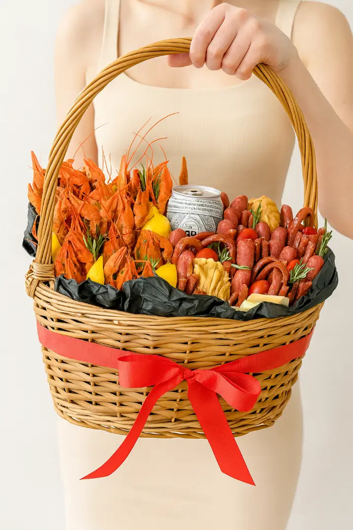 Состав: охотничьи колбаски, колбаски пепперони, чечил, раки, лимон, помидоры,  пиво — 1 банка.