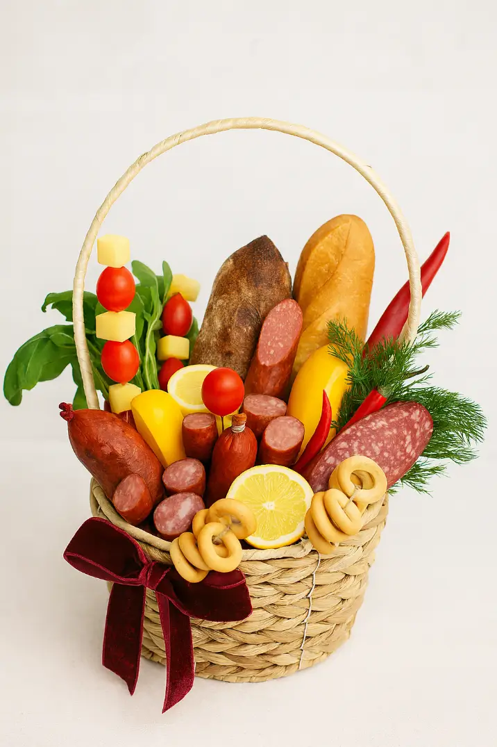 Состав: охотничьи колбаски, колбаса сырокопчёная, лимон, перец, перец чили, сыр, сушки, укроп, щавель.