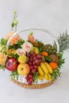 Состав: ананас, кокос, апельсины — 6 шт, виноград, бананы — 6 шт, яблоки, киви, розы, лизиантусы, зелень.