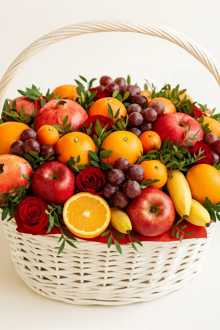 Состав: гранат, апельсины — 9 шт, яблоки — 11 шт, мандарины — 7 шт, виноград, бананы — 6 шт, розы — 7 шт, зелень.