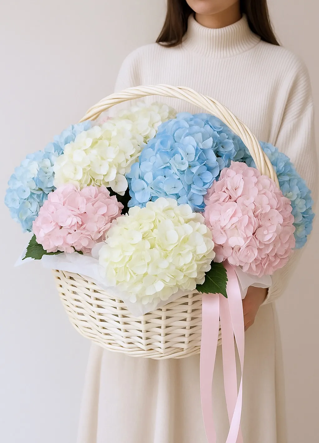 Корзина с гортензией выглядит роскошно и очаровательно. Ажурные, воздушные соцветия означают легкость, радость и чистоту. С помощью такого презента можно вызвать самые искренние эмоции получателя. Пышные цветы в корзине станут замечательным сюрпризом для любимой, подруги, сестры или мамы