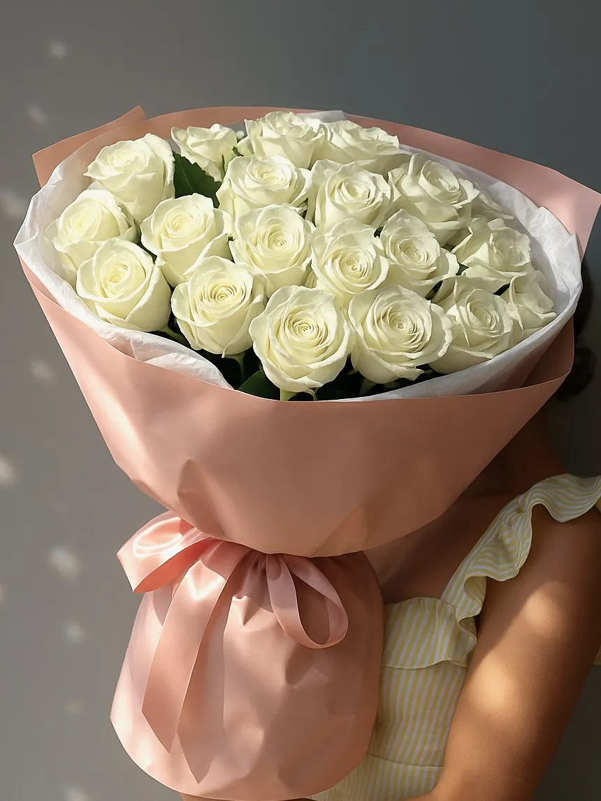 Букет из 19 белых роз – удивительное сочетание пышности и нежности. Белоснежные бутоны расскажут о самых теплых эмоциях и пожеланиях, связанных с получателем. Изысканная композиция прекрасный вариант для признания в любви, предложения руки и сердца. Букет подойдет для поздравления с юбилеем женщину любого возраста.