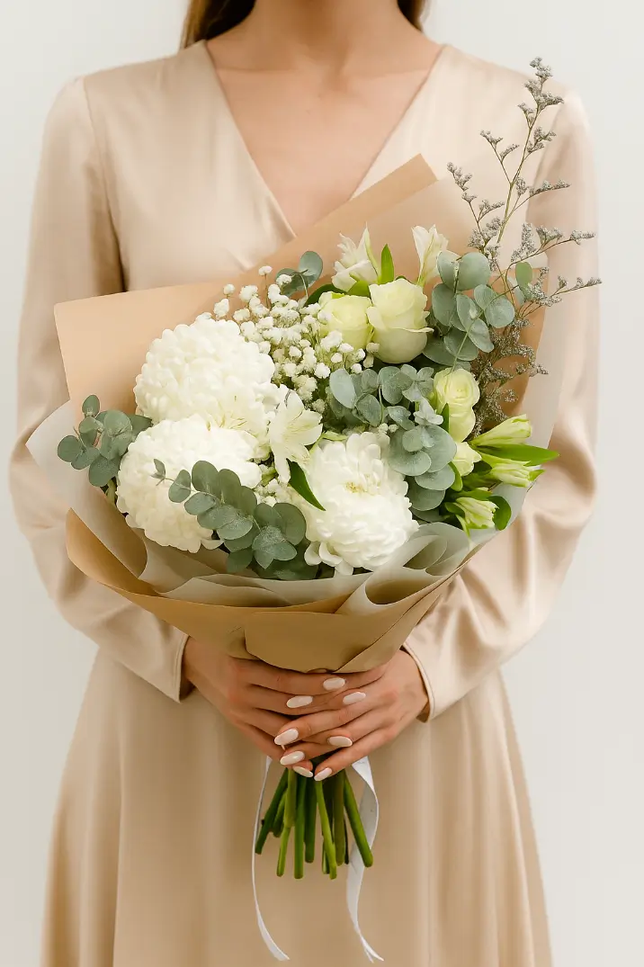 Состав: хризантемы бигуди — 3 шт, роза белая Mondial 50 см — 3 шт, альстромерии — 3 шт, гипсофилы — 2 шт, эвкалипт.