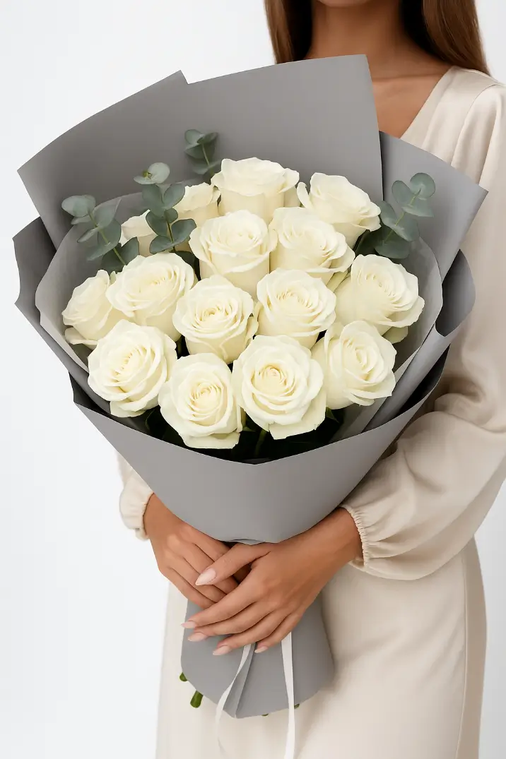 Букет из 15 белых роз – это воплощение нежности, искренности и восхищения. Милый оттенок изысканных бутонов поможет поздравить близкого человека с важным событием. С помощью шикарной композиции можно признаться в чувствах, напомнить о верности, преданности и благодарности. Превосходный презент останется прекрасным воспоминанием на долгие годы.