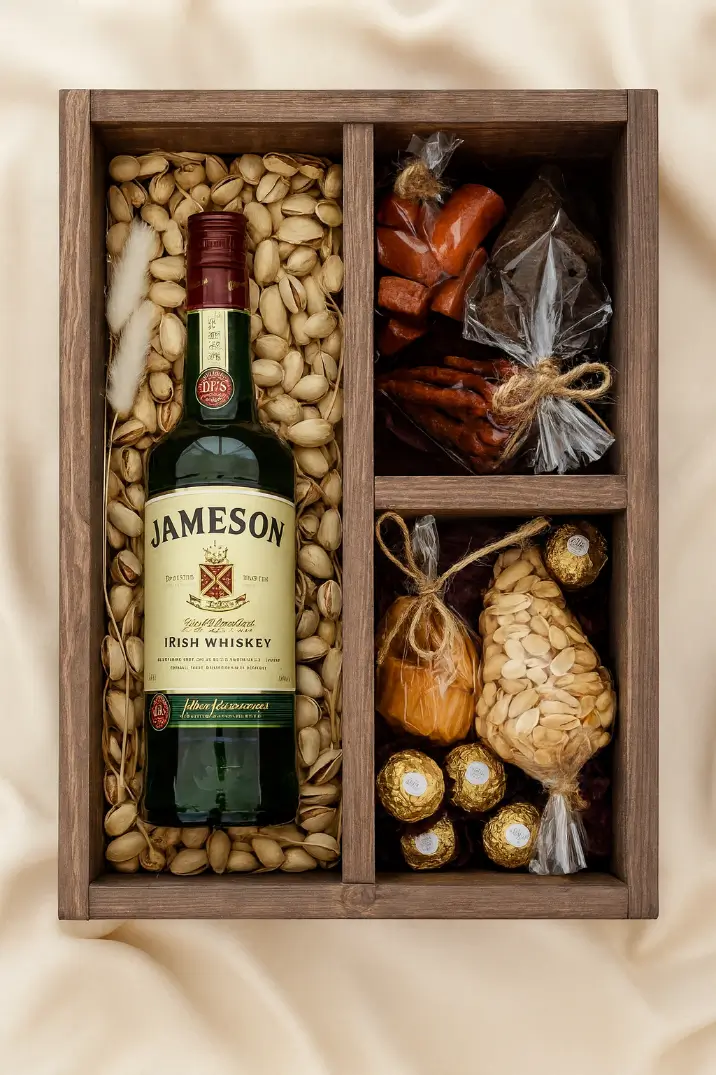 Состав: виски — 0,7 л, фисташки, чипсы, колбаски — 2 видов, гарлики, конфеты ферреро.