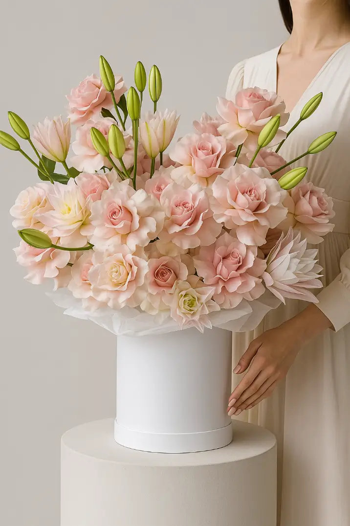 Состав: французские розы — 25 шт, 5 лилий, шляпная коробка