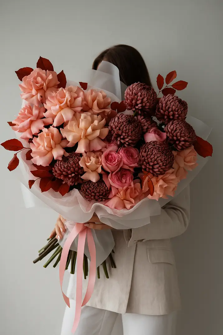 Состав: 11 розы, 2 кустовые розы, 9 хризантем бигуди, 2 декор листья, упаковка.