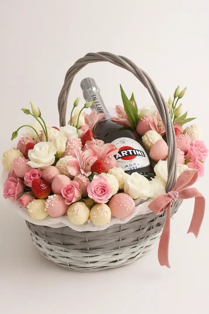 Состав: клубника в шоколаде в корзине в сочетании с цветами, Asti Martini.