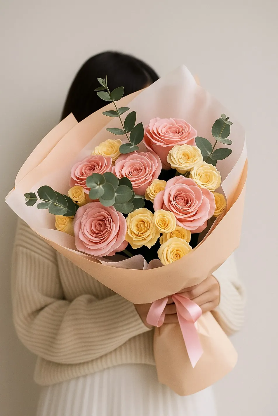 Состав: розы — 5 шт, спрей розы — 4 шт, эвкалипт.