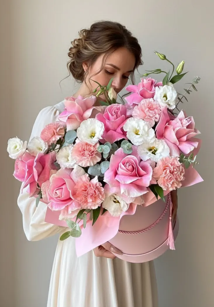 Құрамы: раушан гүлдері - 15 дана, лизиантус - 5 дана, раушан спрейі - 4 дана, гортензия - 2 дана, эвкалипт.