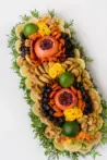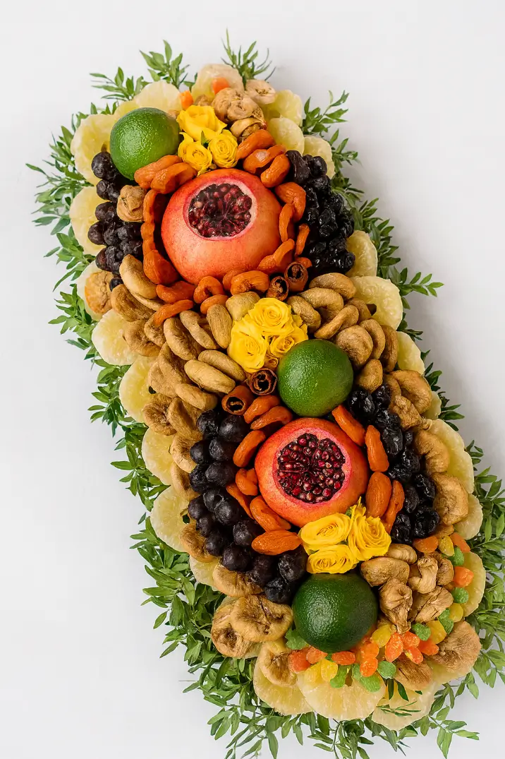 Құрамы: анар, авокадо, кептірілген өрік - 2 түрі, інжір, кептірілген ананас, қара өрік, құрма, тәтті жемістер, сәндік жасыл.