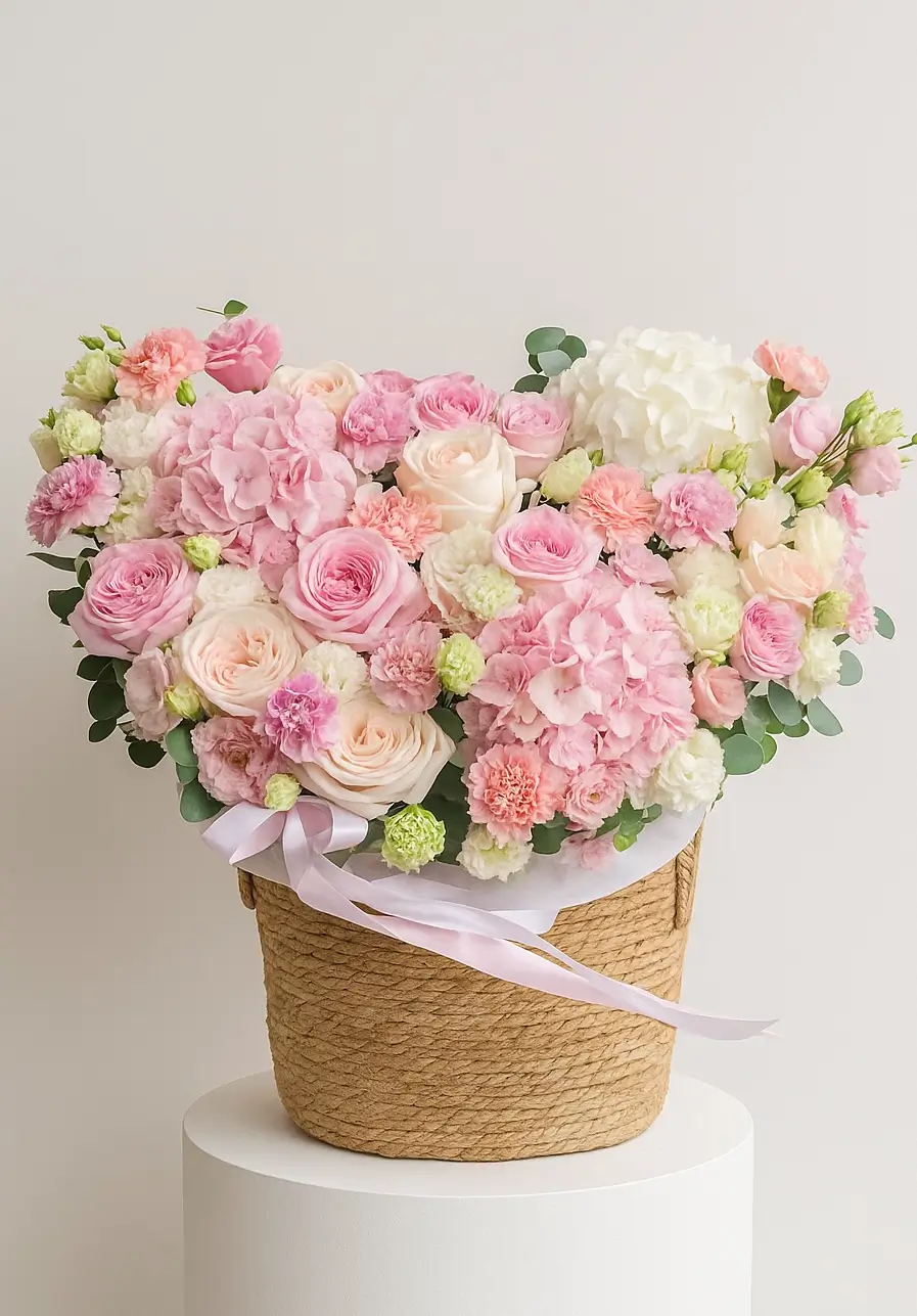 Состав: гортензии — 3, розы — 9 шт, спрей розы — 5 шт, эустома — 7, диантусы — 9, эвкалипт, кашпо.