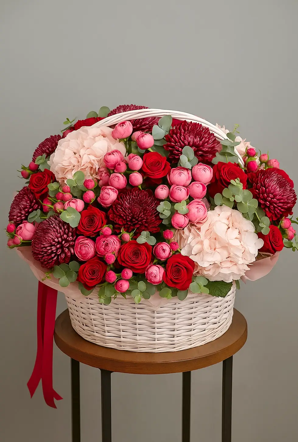 Состав: хризантемы — 13 шт, гортензии — 3шт, розы — 11 шт, спрей розы- 9 шт, эвкалипт, корзина.