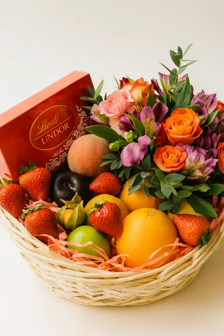 Состав: конфеты Lindt Lindor — 1 коробка, клубника — 7 шт, персики, апельсин, сливы, лайм, розы — 7 шт, альстромерии — 9 шт, зелень.