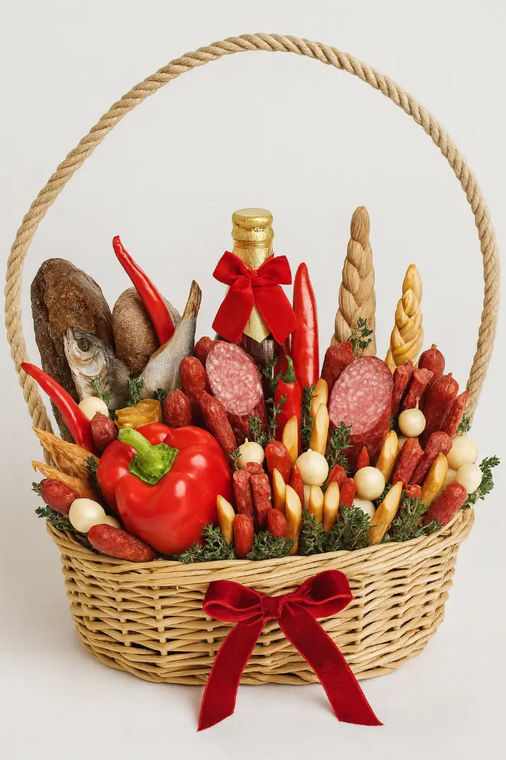 Состав: багет, колбаса сырокоченная, вобла вяленная, перец чили — 3 шт, колбаски охотничьи, сыр скармоца — 10 шт.; сыр чечил, колбаски пиколини, сыр косичка, чипсы мясные, фисташки соленые, орехи в глазури.